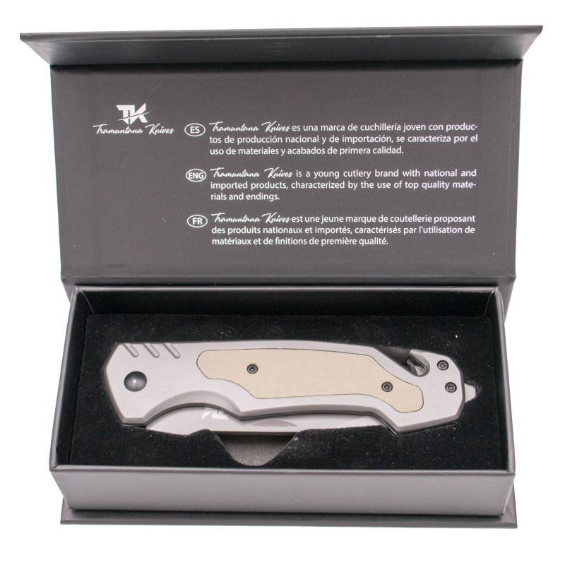 <p>Tramuntana Facas N84T Faca de resgate</p> <p>Punho em aço cinzento revestido a titânio com inserção G10 castanha texturizada.</p> <p>420 lâminas de aço revestidas a titânio cinzento</p> <p>Serras de cabos e quebra janelas. </p> <p>Com clipe.</p> <p>Pega: G10</p> <p>Lâmina: Aço 420</p> <p>Tamanho da lâmina: 9,6 cm</p> <p>Espessura da lâmina: 2,75 mm</p> <p>Tamanho do punho: 13,2 cm</p> <p>Comprimento Total: 22,8 cm</p> <p>Peso: 207 gr</p>