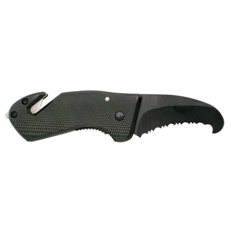 <p>Faca de resgate de emergência Third N69 </p> <p>Cabo de alumínio preto com textura, lâmina de aço preto completamente serrilhada, fechadura de forro. </p> <p>Tem uma serra de cabo e quebrador de vidro. Com clipe. </p> <p> <p>Modelo no.: N69</p> <p>Pega: Alumínio</p> <p>Lâmina: Aço 420</p> <p>Tamanho da lâmina: 5,2 cm</p> <p>Espessura da lâmina: 2,65 mm</p> <p>Corte cm: 5,2 cm</p> <p>Tamanho do punho: 9 cm</p> <p>Comprimento Total: 14,2 cm</p> <p>Peso: 81 gr</p> <p>Clip-On</p>