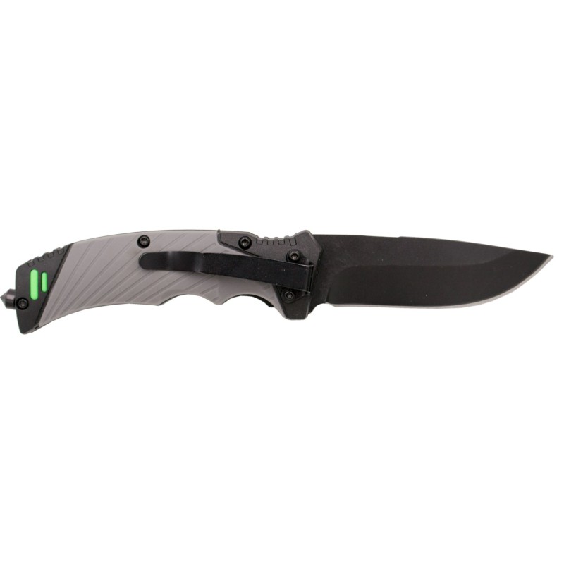 Contém sílex para fazer fogo, apito e quebrador de vidro.