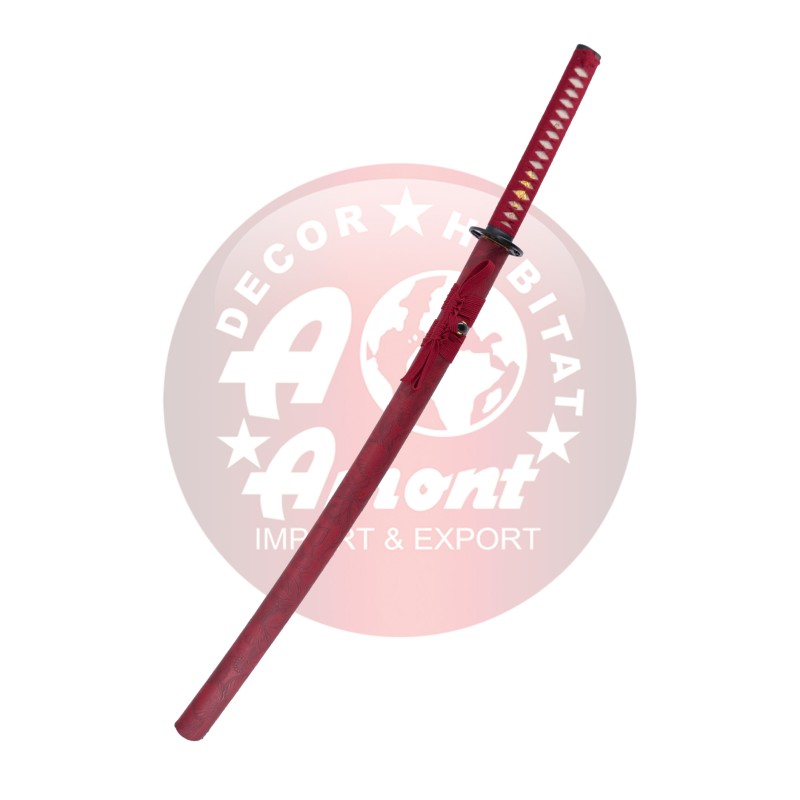 <p>Katana S6040 funcional de lâmina de aço damasco vermelho de 104 cm, bainha de madeira forrada em couro falso vermelho com detalhes em flor de lótus, cabo com cordão vermelho com couro de arraia genuína. Com suporte. </p> <p> <p>Tamanho total: 104 cm</p> <p>Tamanho da lâmina: 71,5 cm</p> <p>Espessura da lâmina: 7,5 mm</p> <p>Pega: Corded</p> <p>Peso: 1305 gr</p> <p>Apoio: Sim</p>