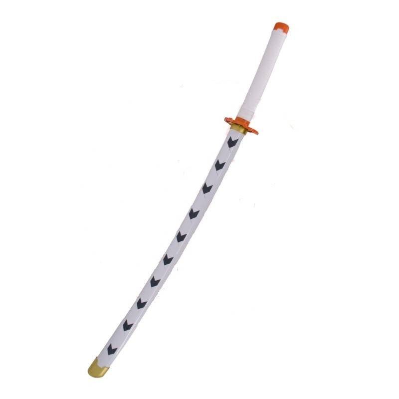 Demon Slayer Katana S5037 empunhado por Rengoku Kyoujurou, réplica não oficial de lâmina de bambu de 105 cm, cabo com cordão de couro falso branco e bainha branca com detalhes.