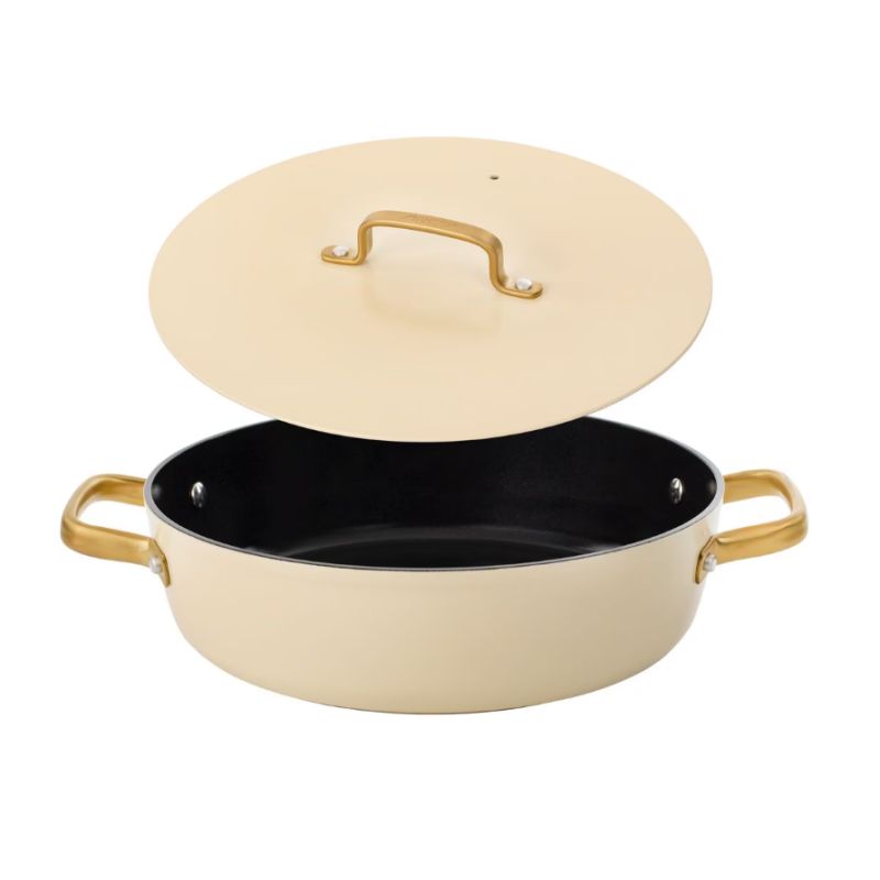 <p>A caçarola Samoa Iconic 28 cm baixa em bege é a escolha ideal para quem procura cozinhar de forma rápida, eficiente e com estilo. O seu revestimento cerâmico antiaderente permite cozinhar com menos óleo, facilitando a limpeza e ajudando a obter refeições mais saudáveis. </p> <p>Distribuição homogênea de calor: Feita de alumínio forjado para cozimento rápido e uniforme.</p> <p>Design sofisticado: Acabamento em bege com cabo dourado, ideal para qualquer cozinha moderna.</p> <p>Versátil: Graças ao seu design baixo, esta caçarola é perfeita para preparar guisados, batatas fritas e batatas fritas.</p> <p>Espessura: 4.5mm incluindo indução</p> <p>Diâmetro: 28 cm</p> <p>Capacidade: 4.3 Litros</p>