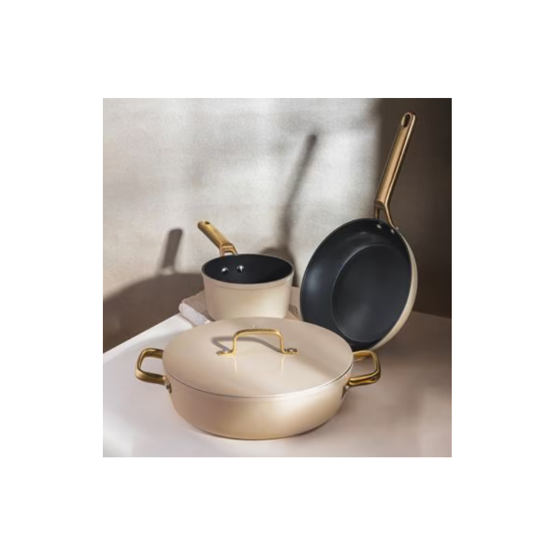 Design elegante com cores bege e cabo de aço inoxidável dourado.