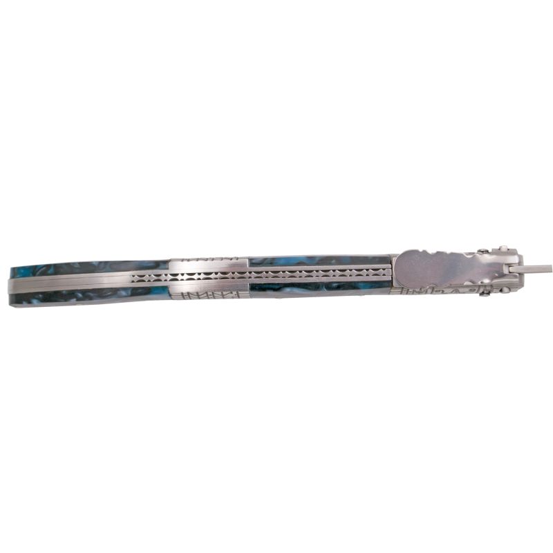 O resto do cabo desta faca de mola é composto por inserções de acrílico azul.