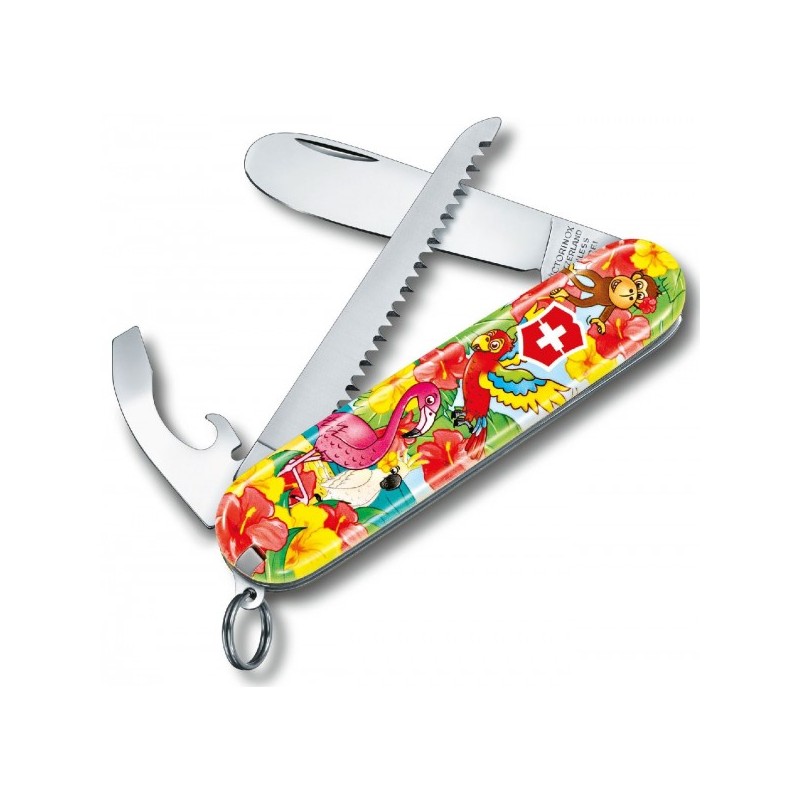 <p>Faca para crianças Victorinox.</p> <p>Fabricado na Suíça.</p> <p>Ele é projetado para crianças, daí sua lâmina de ponta redonda e inclui um cordão para pendurá-lo.</p> <p>Tamanho da lâmina: 5.4cm</p> <p>Comprimento: 84mm</p> <p>Largura: 23mm</p> <p>Profundidade: 11.5mm</p> <p>Peso: 39gr</p> <p><span style="text-decoration:underline;"><strong>Tem 9 funções: </strong></span></p> <p>1- Lâmina grande com ponta arredondada </p> <p>2- Abridor de garrafas</p> <p>3- Abridor de latas</p> <p>4-Chave de fenda</p> <p>Isolante decapante de 5 fios </p> <p>6- Anel Inoxidável </p> <p>7- Pinça </p> <p>8- Palitos</p> <p>9-Serra de madeira </p> <p>