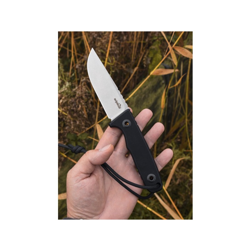 - Material da lâmina: aço inoxidável 14C28N com acabamento Stonewash
