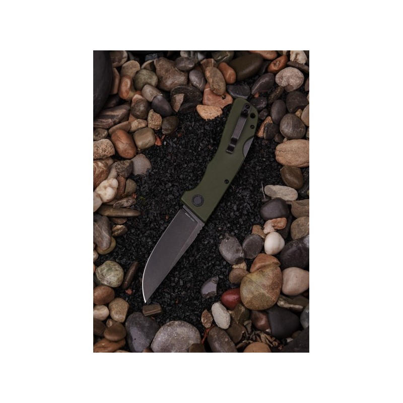 - Material da lâmina: aço inoxidável 14C28N com acabamento blackwashed