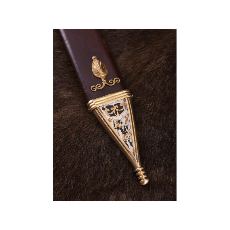 <p>Romano tipo Pompeia gladius com bainha, século 1.</p> <p></p> <p>- Material: Lâmina de aço de mola EN45 (aço carbono, não inoxidável), cabo de madeira com porca de fixação de latão - Comprimento total: aprox. 67,5 centímetros</p> <p>- Comprimento da lâmina: aprox. 49 centímetros</p> <p>- Espessura da lâmina: aprox. 4,3 mm / 4 mm (bordas aprox. 1 mm)</p> <p>- Comprimento do punho: aprox. 18,5 cm (secção do punho aprox. 9 cm)</p> <p>- Largura máxima da lâmina: aprox. 4,4 mm (bordas aprox. 1 mm). Largura da lâmina: aprox. 4,5 centímetros</p> <p>- Centro de gravidade: aprox. 13 cm à frente da guarda</p> <p>- Inclui bainha de madeira com bainha de couro genuíno e acessórios de latão</p> <p>- Peso sem bainha: aprox. 0,6 kg</p> <p>- Peso com bainha: aprox. 0,95 kg As especificações acima podem variar ligeiramente de um modelo para outro. O aço utilizado não é inoxidável e pode apresentar ligeiros sinais de corrosão. Recomendamos a manutenção regular da lâmina e da bainha, por exemplo com Ballistol, um óleo universal ideal para preservar utensílios de aço.</p>