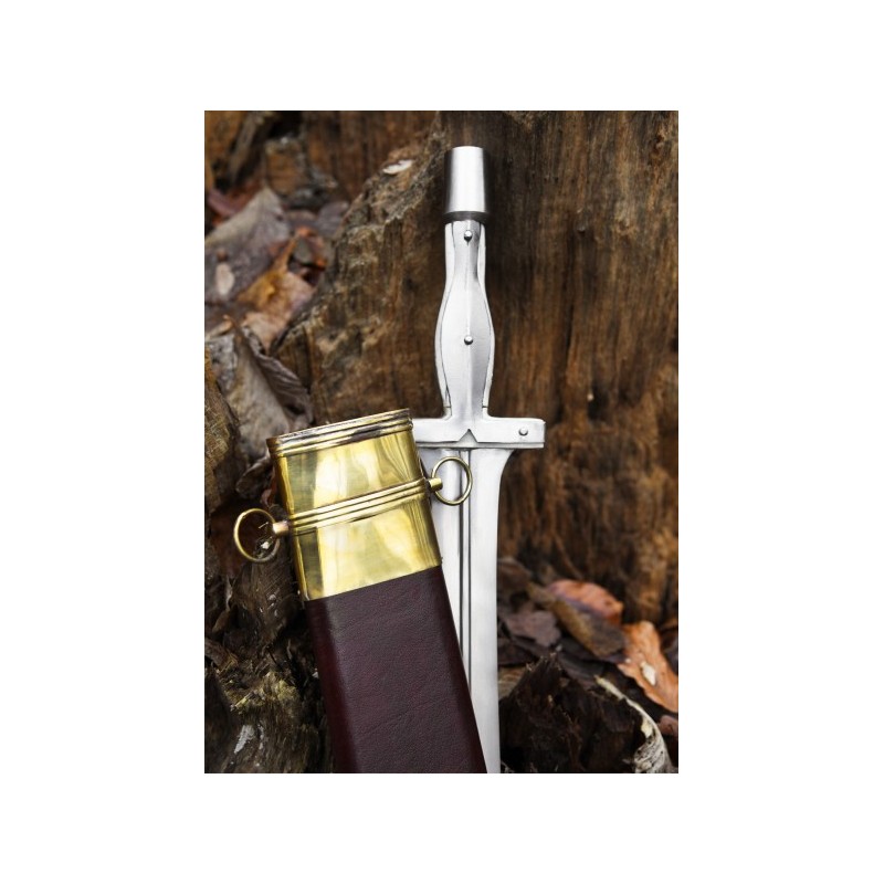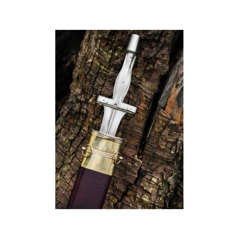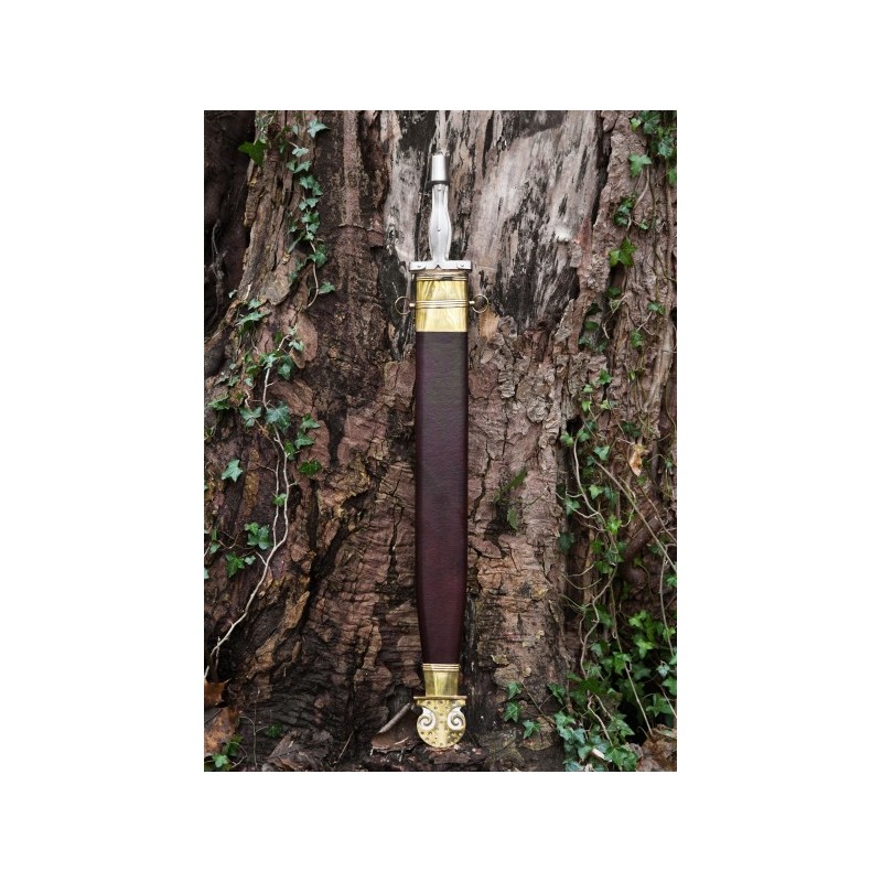 <p>Espada hoplite de Campovalano com bainha</p> <p></p> <p>- Material: Aço carbono </p> <p>- Comprimento total: aprox. 76,5 cm </p> <p>- Comprimento da lâmina: aprox. 59,5 cm - Peso (sem bainha): aprox. 1,15 kg </p> <p>- Inclui bainha de madeira e couro combinando com ferragens de latão</p> <p></p>