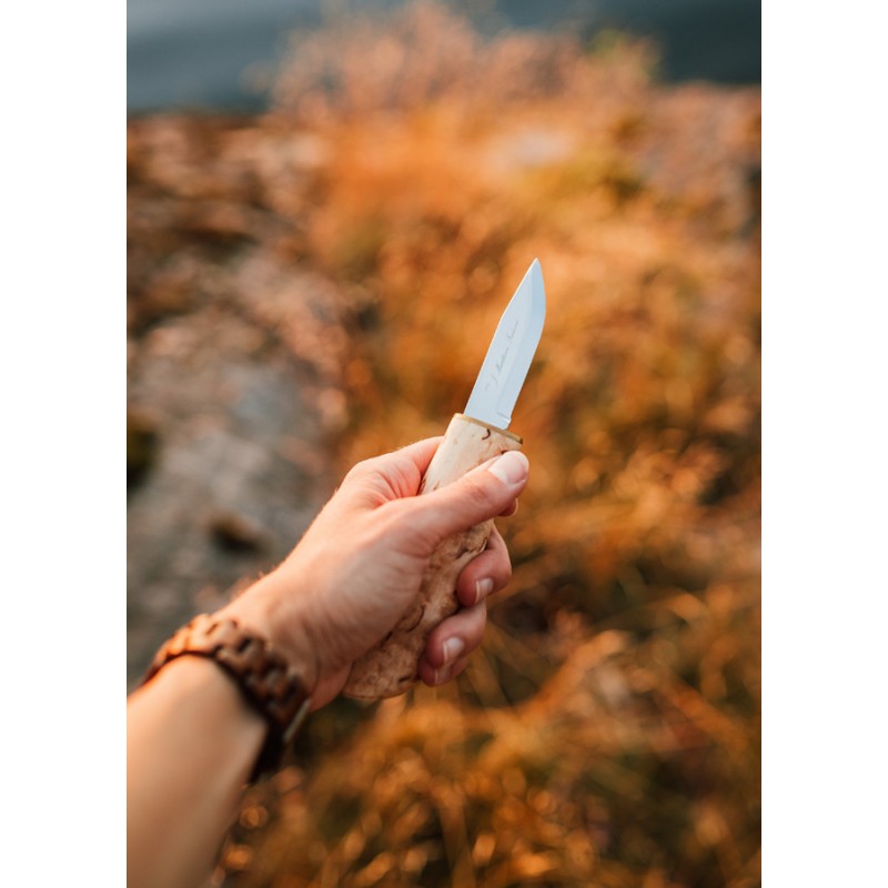 Sua lâmina relativamente curta é prática para trabalhos que exigem precisão. Neste modelo atualizado, o design tradicional da lâmina é combinado com um elegante cabo de bétula encaracolado. O Handy inclui uma elegante capa em pele.