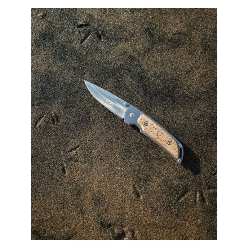 O cabo é decorado com bela madeira de bétula finlandesa encaracolada. A lâmina é feita de aço inoxidável japonês com um acabamento acetinado. Inclui clipe de cinto na alça.