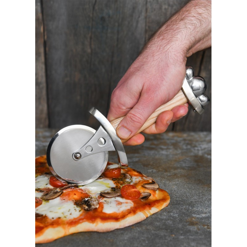 <p>O cabo ergonómico em madeira de freixo proporciona uma pega segura e confortável, enquanto o design Viking combina funcionalidade e estética. Para proteger os dedos da lâmina ao cortar, o cortador de pizza tem uma guarda em forma de cruz, semelhante a uma verdadeira espada viking. O botão de três lóbulos, tal como a guarda, é feito de aço.</p> <p>A lâmina afiada e de alta qualidade em aço inoxidável corta facilmente a massa de pizza, grossa e fina, em porções uniformes. Este cortador de pizza não é apenas ideal para cortar pizza, como também pode usá-lo para cortar facilmente bolos flambés, pastelinhos folhados ou waffles.</p>