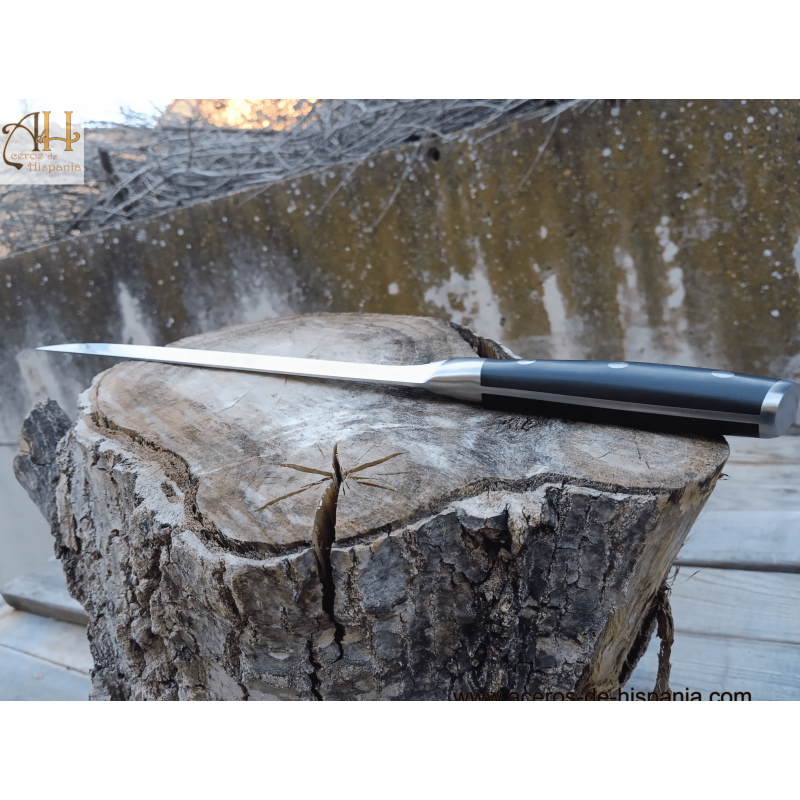 As facas de presunto Toledo são flexíveis, com uma lâmina longa e estreita para permitir que você corte bem o presunto e alcance todas as partes.