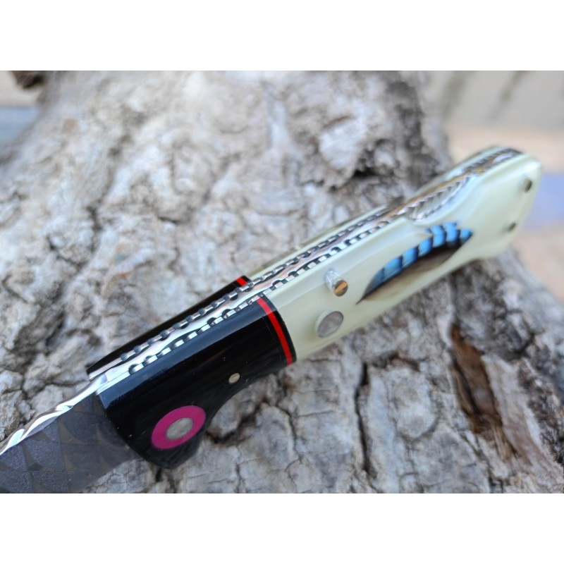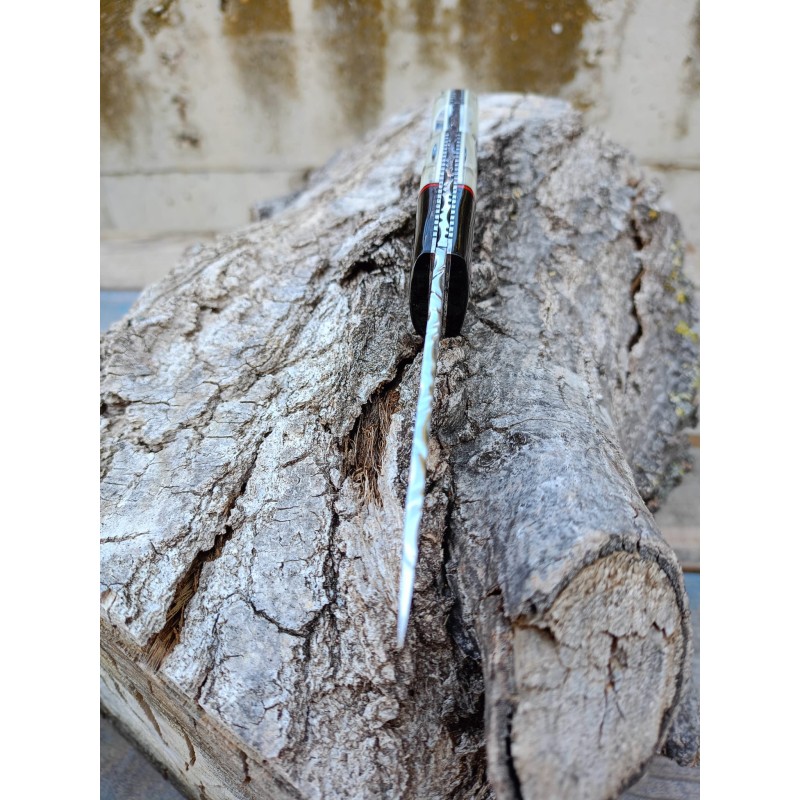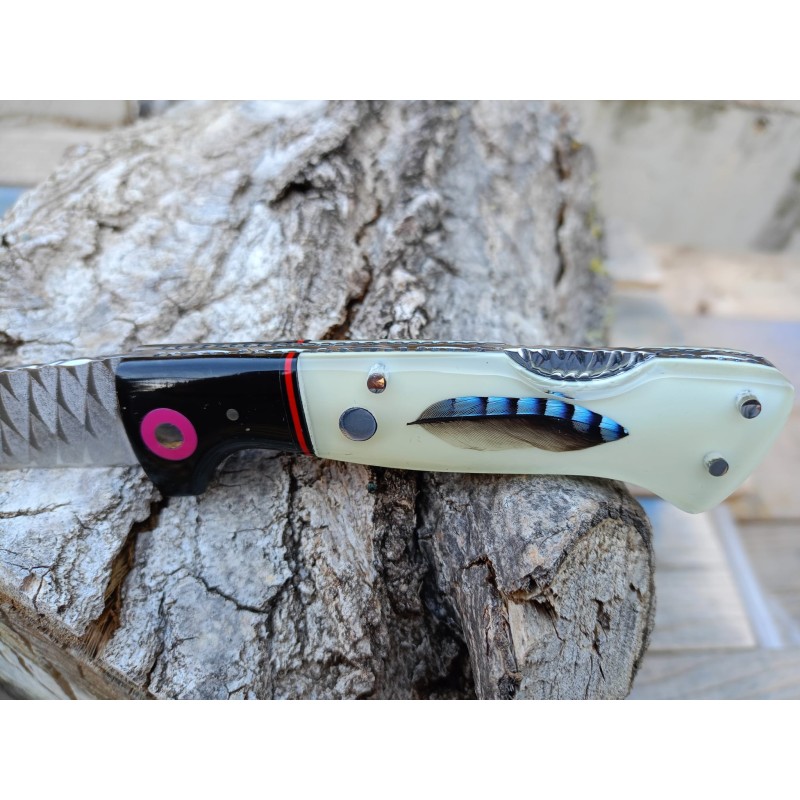 <p>Faca artesanal Nieto Art-16</p> <p>- Lâmina de aço AN-58<br />- Cabo de resina óssea e metacrilato com inserção de pena natural<br />- Ferrule: katex<br />- Inclui apresentação de caso com certificado<br />- Comprimento da lâmina: 8 cm<br />- Comprimento total: 18,5 cm<br />- Peso: 108 gramas</p>
