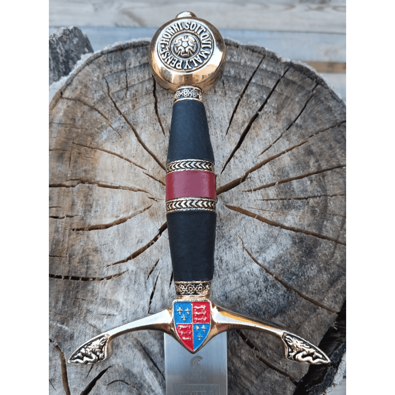 A adaga diz: "Honi soit qui mal y pense", que é interpretado como "O mal está naqueles que pensam o mal". Este é o lema da Ordem Cavalheiresca Inglesa da Jarreteira, fundada no século 14 por Eduardo III. O Príncipe Negro fazia parte dessa ordem.