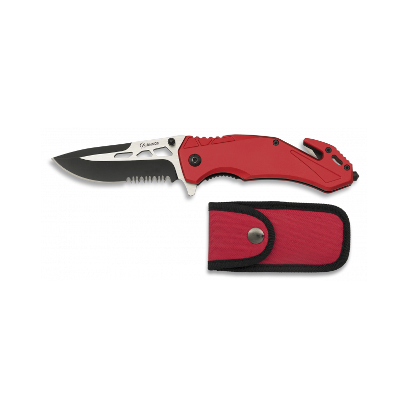 Direitos autorais<br />Projetado em Espanha<br />Marca: ALBAINOX<br />Faca Tática<br />Punho: Alumínio<br />Lâmina: Aço inoxidável<br />Tamanho da lâmina: 8,5 cm<br />Clipe<br />Cortador de cinto de segurança<br />Ponta do Disjuntor de Vidro<br />Bainha de nylon